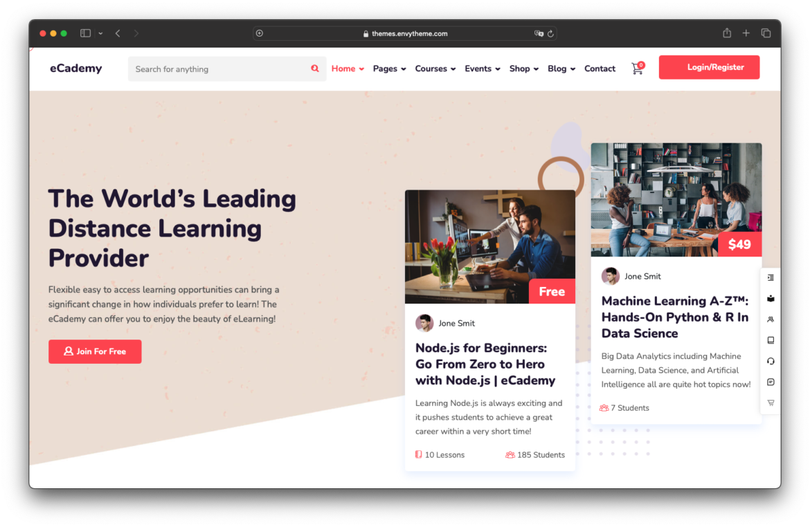 eCademyは、教育機関やオンラインコースの販売に最適なテーマであり、学習管理やコース販売に必要な機能を簡単に実装できる便利なツールとなっています。