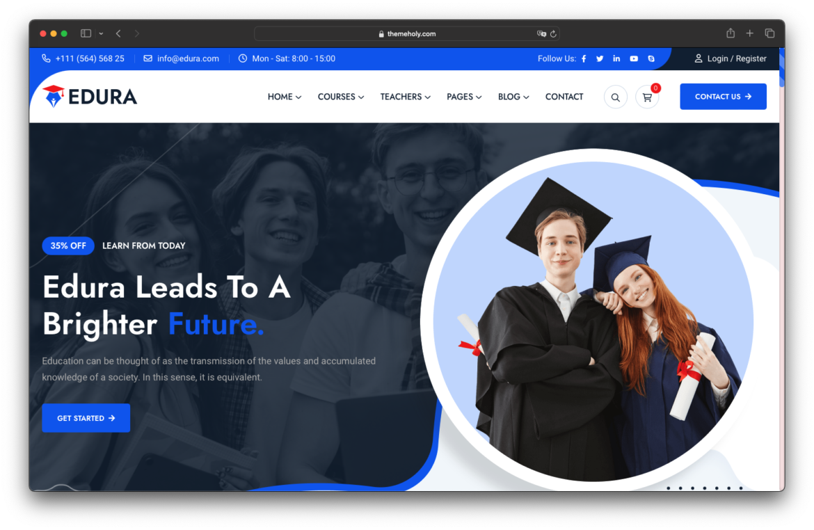 Eduraは、教育関連のウェブサイトに特化した学習管理システム(LMS)対応テーマです。オンラインコースの提供や学校、教育機関のウェブサイト運営に最適な機能を備えています。